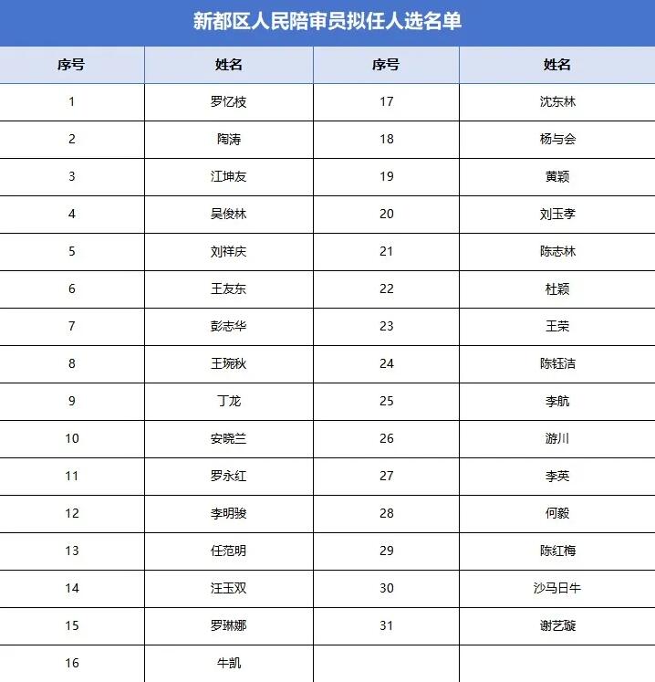 成都市新都区司法局 成都市新都区人民法院 成都市公安局新都区分局 全区人民陪审员拟任人选名单公示